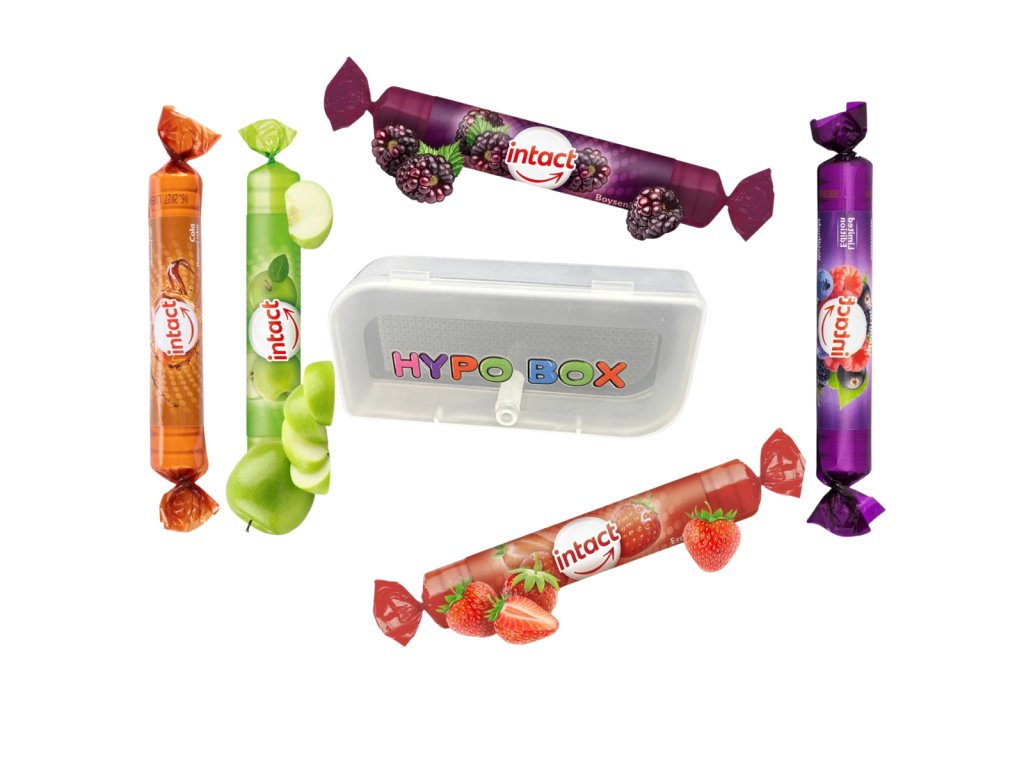 Obsahuje pět příchutí oblíbeného hroznového cukru Intact (40 g) – jahoda, jablko, cola, boysenberry a lesní ovoce – v praktickém balení s krabičkou Hypo Box.