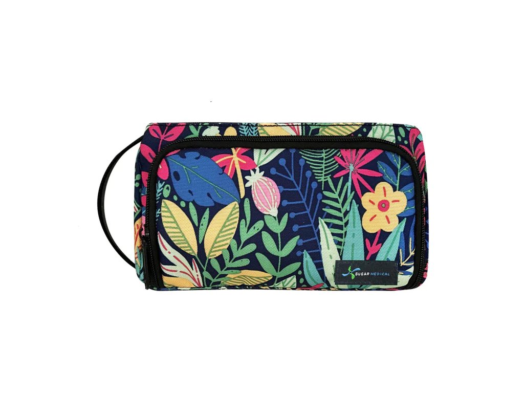 Uvnitř se nachází přihrádka na 4 pera nebo 4 lahvičky, dále prostor pro glukometr, testovací proužky, lancetu a další drobnosti. Celé pouzdro je uzavíratelné na zip a vybaveno madlem pro snadné přenášení.